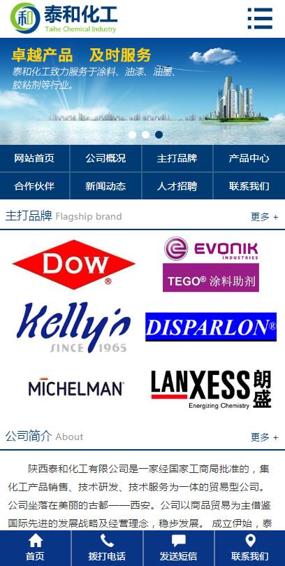 陕西泰和化工有限公司是一家经国家工商局批准的,集化工产品销售、技术研发、技术服务为一体的贸易型公司。公司坐落在美丽的古都——西安。公司以商品贸易为主,借鉴国际先进的发展战略及经营理念,稳步发展。 成立伊始,泰和公司便以市场变化为导向,不断引进国外先进的助剂产品,积极引导和服务于涂料、油漆、油墨、胶粘剂行业,在汲取各行业优秀的管理理念与经营模式的过程中,逐步形成了我们技术服务为主,销售为辅的经营思路。我们愿竭尽所能解决您产品中遇到的各种各样的难题。 我们目前代理的产品主要有:德国TEGO助剂,台湾公隆金属络合染料,德国明凌助剂,德国LANXESS防腐剂,美国陶氏乳液助剂,日本帝司巴隆防沉剂,麦可门蜡乳液,及其他配套助剂等。
