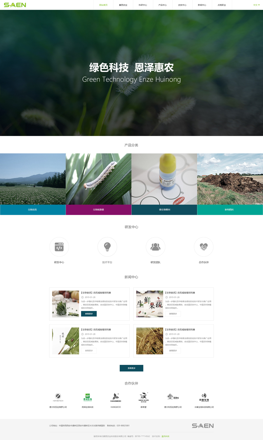 赛恩农业以西北农林科技大学宗兆峰教授为技术研发团队的核心负责人,在优质菌株提取(筛选、保存及复壮);高浓度(固态、液态)微生物培养、发酵;微生物菌剂应用技术三大领域与国内外多个知名机构和企业保持合作关系。产品涵盖微生物菌剂,微生物菌肥,微生物土壤处理剂等多种类型。